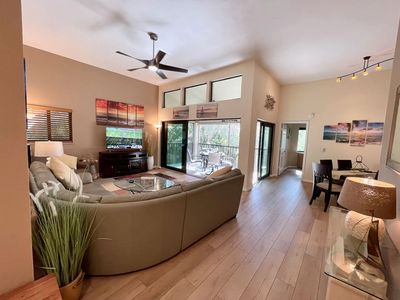 Samsung smart TV with Fision Cable, ceiling fan and sliding patio doors to the covered lanai